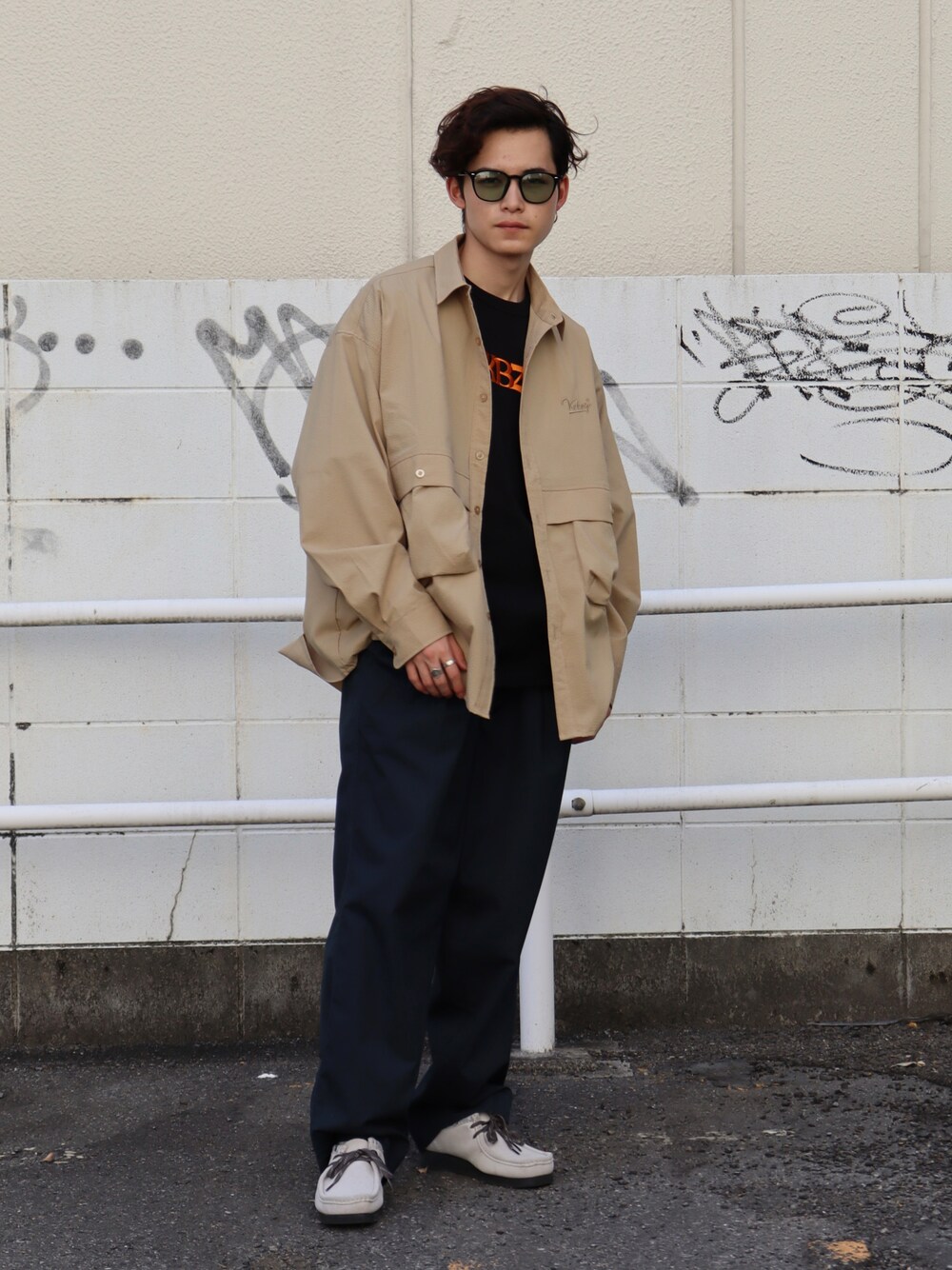 大人カジュアルコーデ。 shirtの間に見えるフロントロゴのTEEをアクセントにクラークスでカチッとしました。