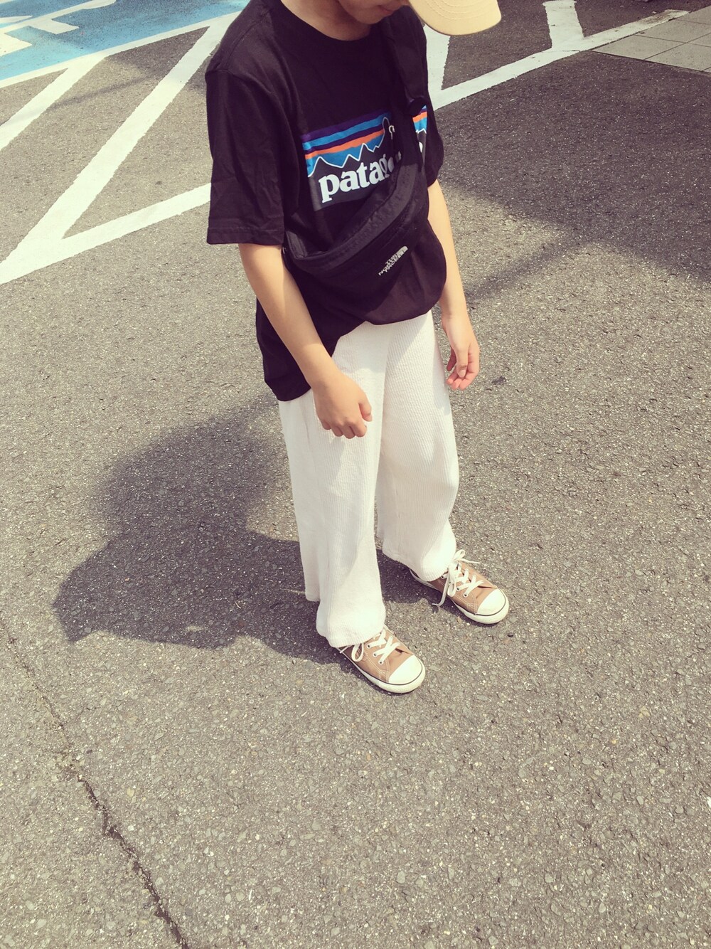 ブラウン系のスニーカーを着用したキッズの春コーディネートの1枚目の写真