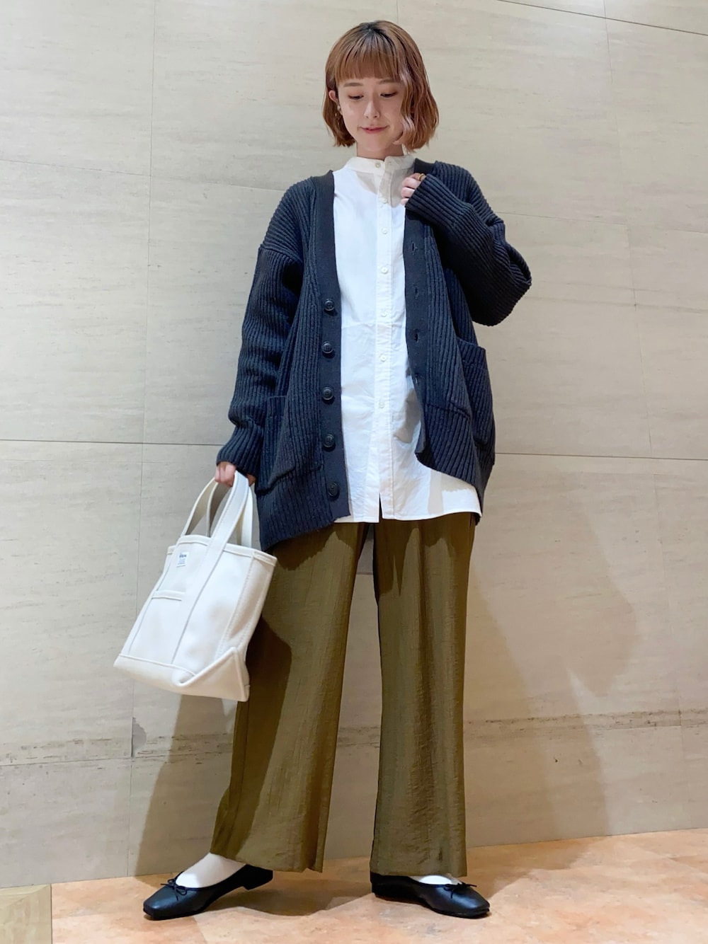 カーディガンは、ゆとりのあるビッグシルエットですがしっかりと落ち感が出るので広がりすぎず着ていただけます🌱 身幅も腕まわりもゆとりがあるので 中に着込んでも締め付け感なく着ていただけます♪ カラーパンツと合わせて秋らしさをプラスしました◎