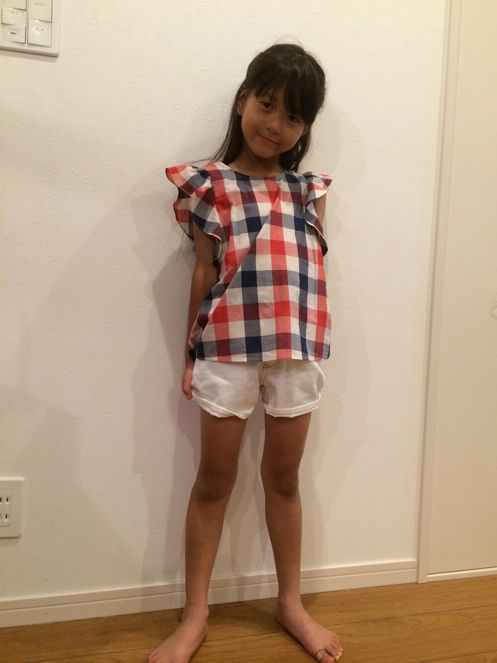 赤のチェックブラウスに白いショートパンツで大人ぽく真夏のスタイルで!