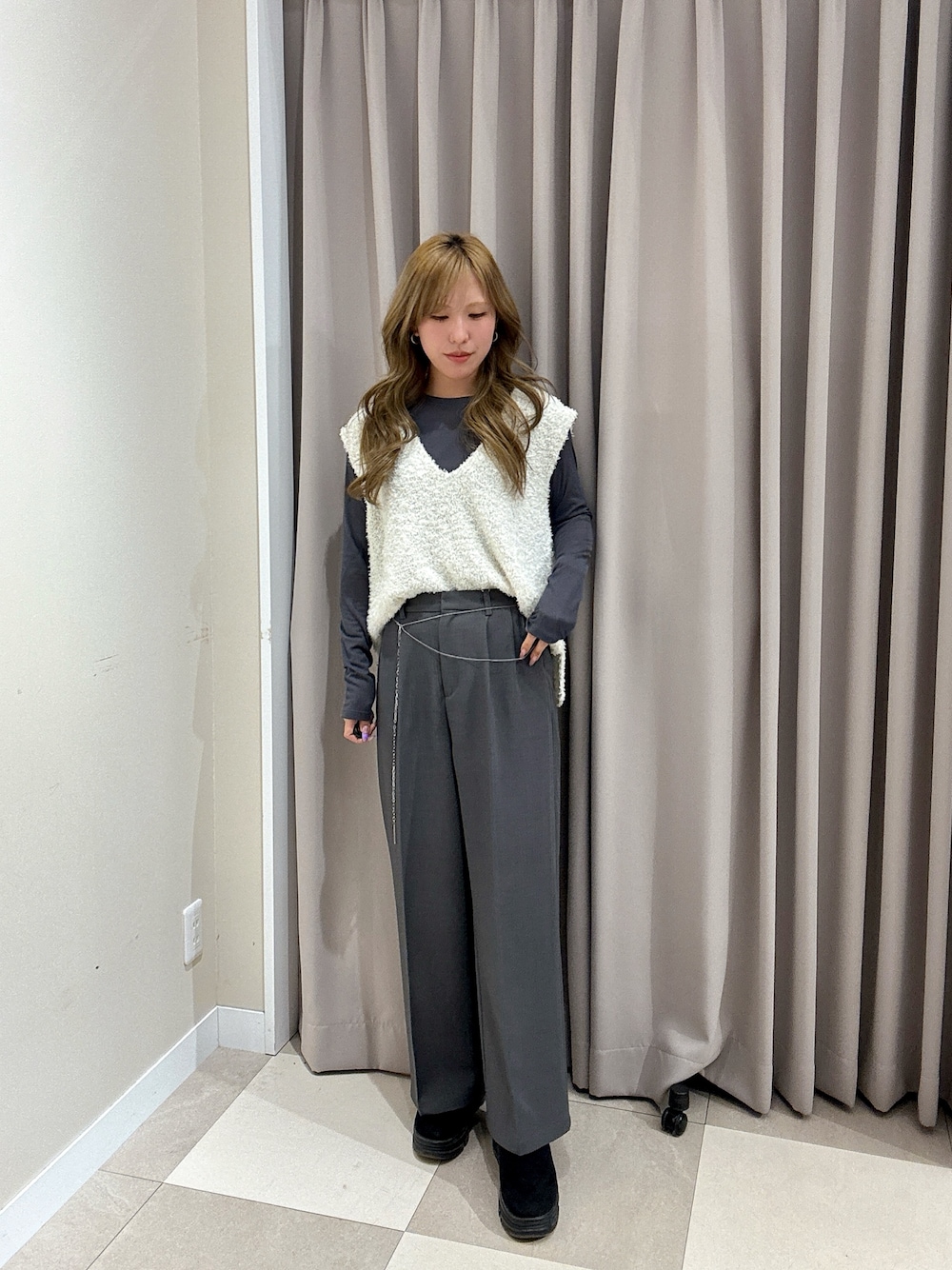 立体感のある生地感が可愛いベストと、 チェーン付きパンツで一癖コーデ⛓🩶 ベストは肩にかかるデザインなので 気になる二の腕も華奢見えします👀💭 パンツのチェーンは外せるので 着回し力抜群な1枚です🤭