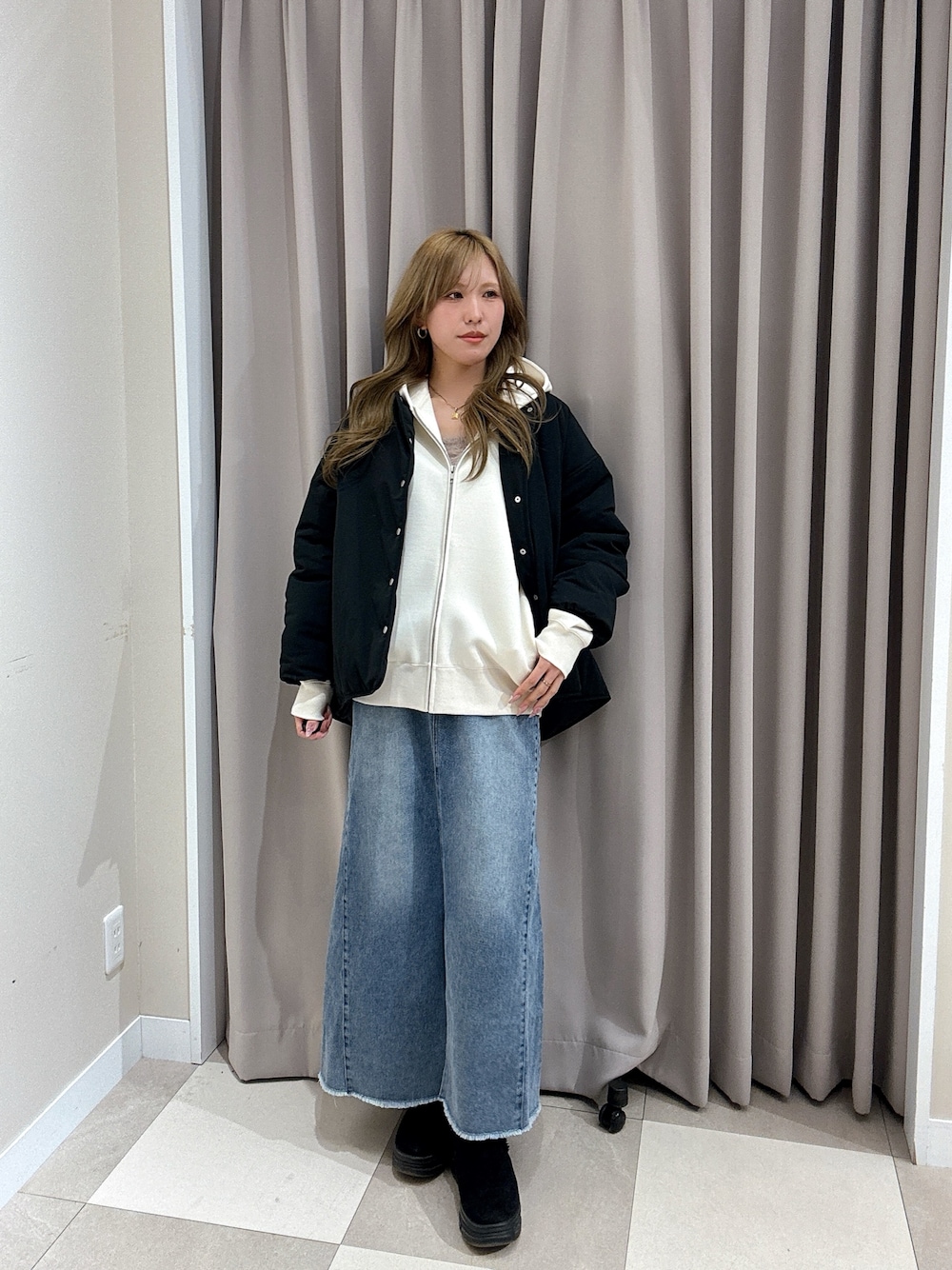 季節の変わり目にピッタリな中綿ブルゾン🖤 裾に向かって緩やかに広がるシルエットで、 気になるヒップも隠してくれます🫣 暖かく、軽いのも嬉しいポイントです🥹✨️ パーカーや厚手のお洋服を中に来ても 苦しくないので、是非レイヤードを楽しんで頂きたいです🤤