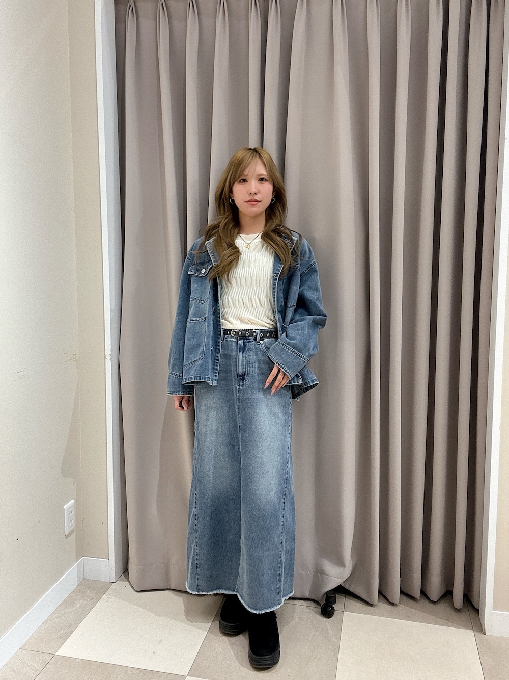 デニムのセットアップ風🩵🩶 ̖́- インナーのシャーリングトップスとの相性抜群です🤤