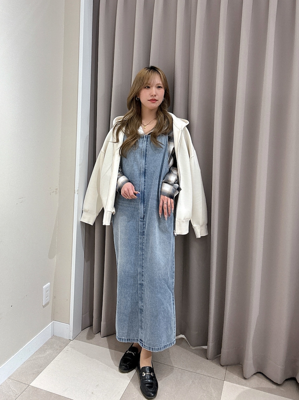 春のお出かけコーデ🚗³₃🤍 デニムキャミワンピ×チェックシャツは 間違いなしの組合せ🫶🏼 3月とはいえまだ肌寒い日もあるので、 春らしいホワイトのパーカーで対策も😤 紫外線も気になって来る季節なので 1枚羽織を持っておくと便利です🙆♀️🙆♀️