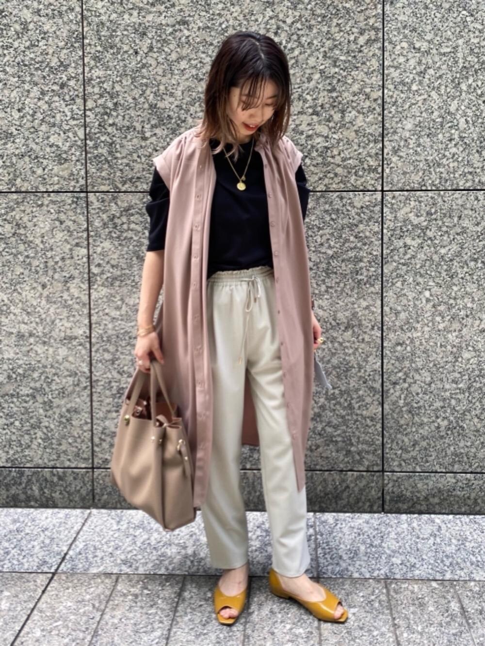 【身長: 162cm all item: FREE shoes: 23.5cm】 ワンピースのフロントボタンを全て外し、トレンド感のあるジレ風にアレンジしました。気分を変えられるオススメのコーディネートです。
