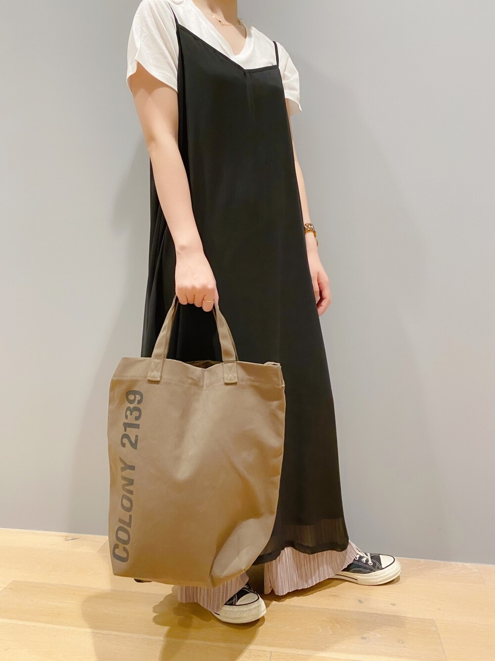 riho colony2139のワンピース「デシンバッククロスキャミソールワンピース」を使ったコーディネート