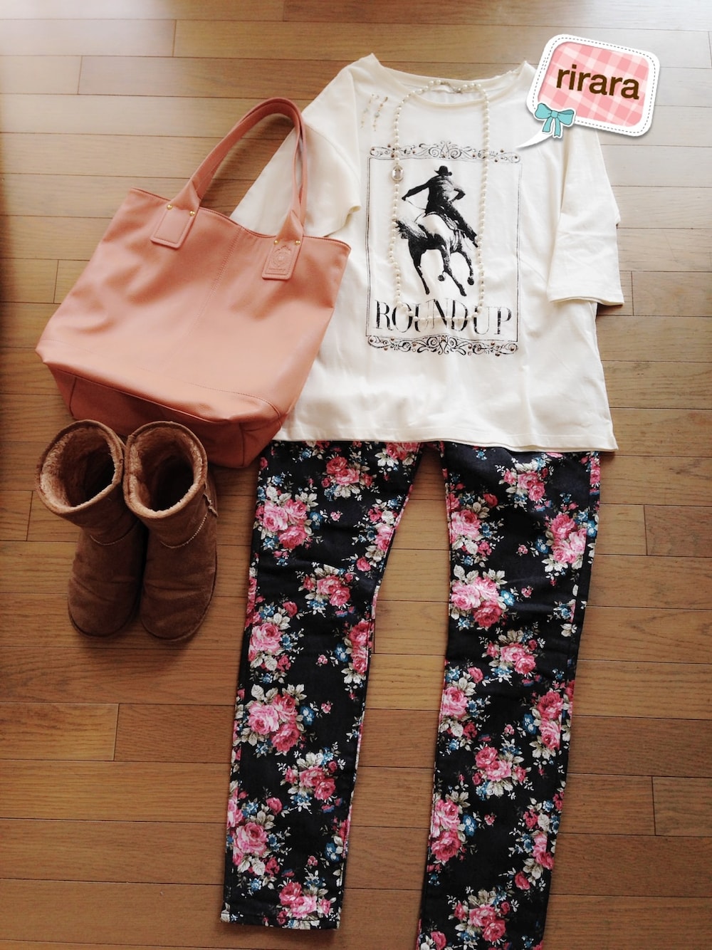 花柄で春気分♡ でも、まだ寒い꒰⁎˃ ॢꇴ ॢ˂⁎꒱➴ෆ⃛ ロンT GU フラワー柄パンツ GU ブーツ UGG バッグ mikoa 〔ローリーズファーム〕 ネックレス ピアスはノーブランド