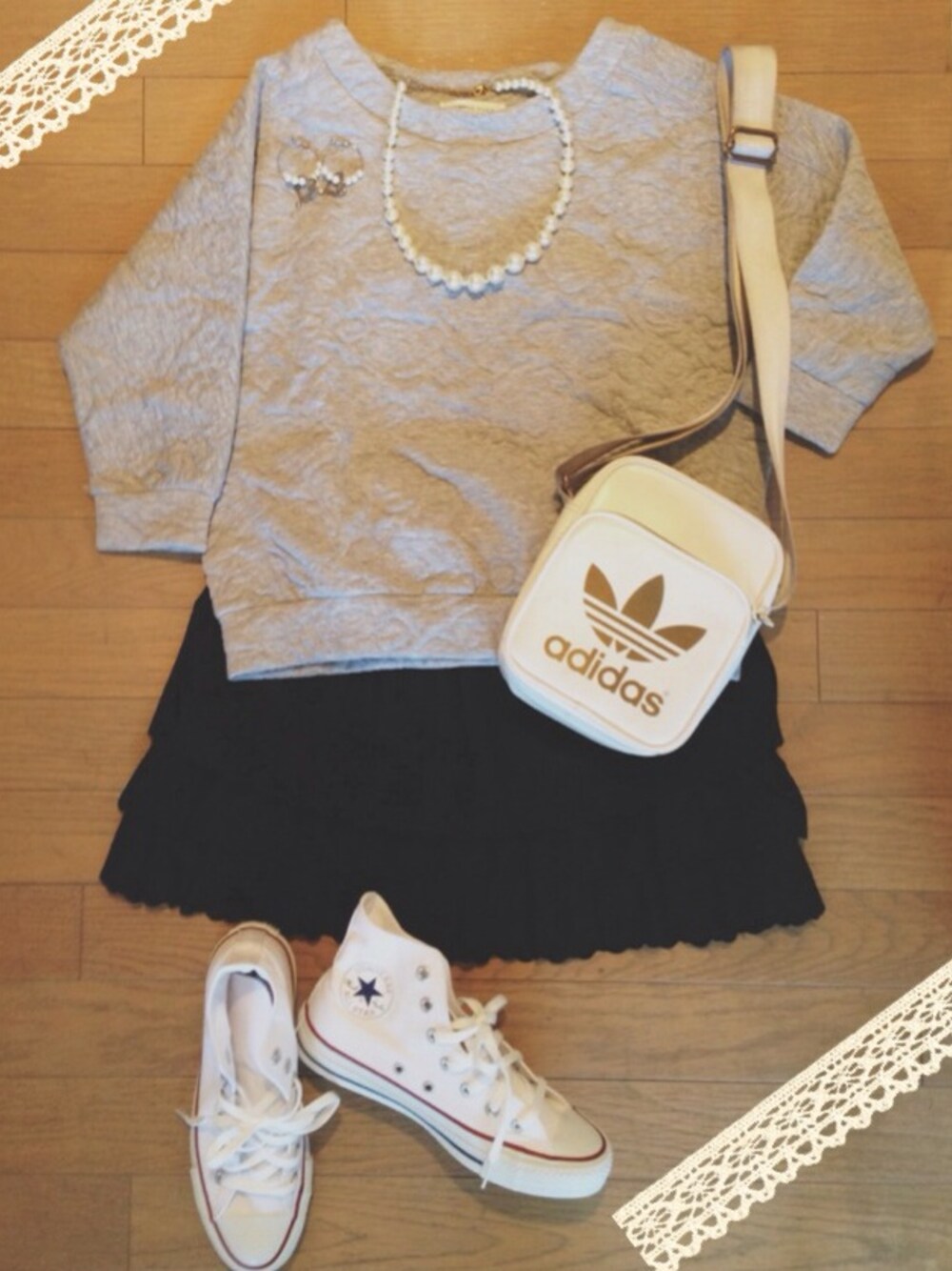 トップス*LOWRYS FARM スカート*Heather ハート×パールピアス*Heather ネックレス*ブランド不明 バッグ*adidas スニーカー*コンバース これはポシェットと言えるかなw꒰⌯˟ॢ⌣˟ॢ⌯꒱ *ೄ̥̊ これにタイツを履いてラクチンコーデ♡ このHeatherのスカートはストラップつきで キャミにも🎵