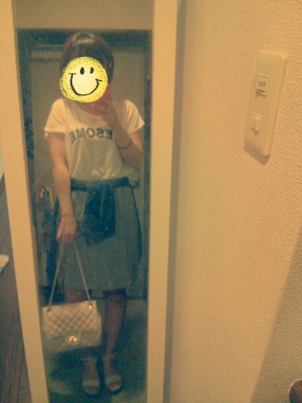 Tシャツ→イーハイフン スカート→イーハイフン 腰巻きシャツ→ハニーズ バッグ→INGNI サンダル→THE EMPORIUM ジャージ素材?のスカートをチェーンバッグとサンダルを合わせてきれいめに着るのが好きです♪