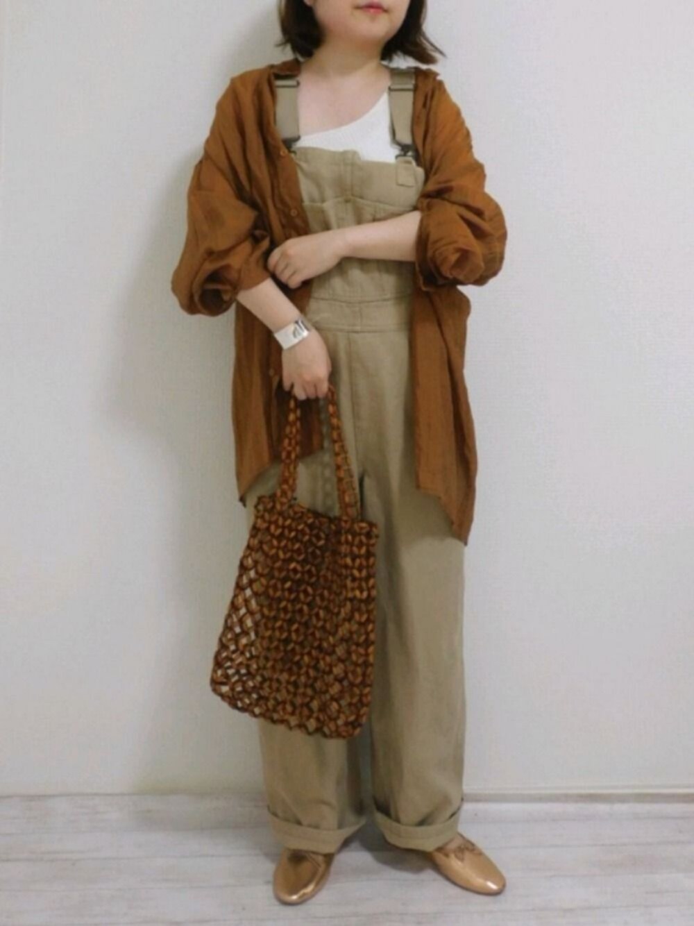 ワンショルにサロペにシアーシャツでワントーン! 去年、夏中使ってたウッドビーズバッグは今年もヘビロテ(*^-^*) 今日は雨でひんやりですね💦 見に来てくださり、ありがとうございます🙇✨