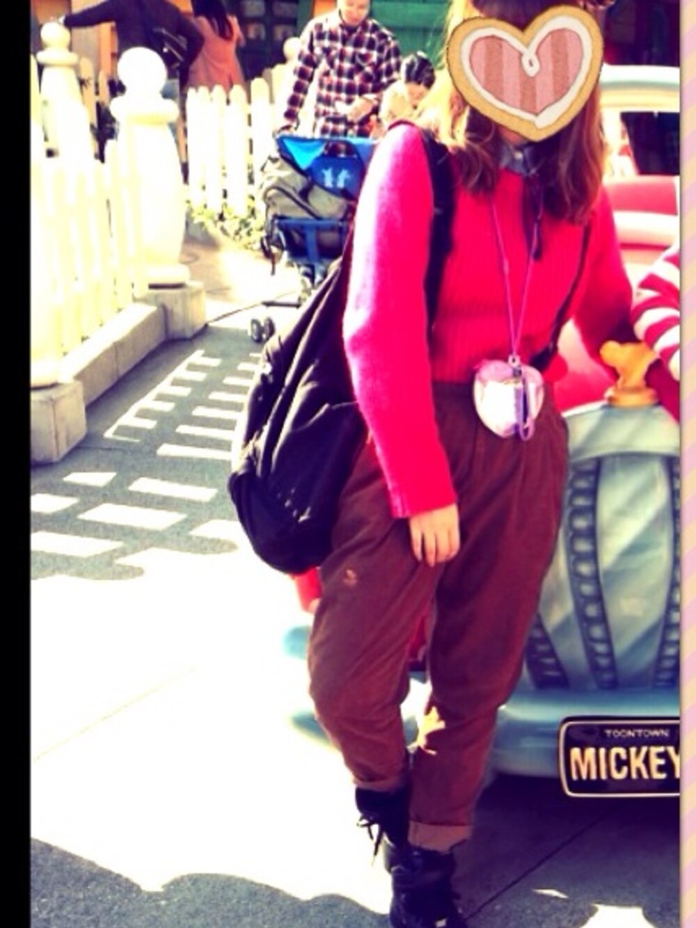 ディズニーふぁっしょん☻ インナー.forever21 ニット.スピンズ サスペンダー付パンツ.forever21 靴.ナイキ リュック.無印良品 カチューシャ.TDL