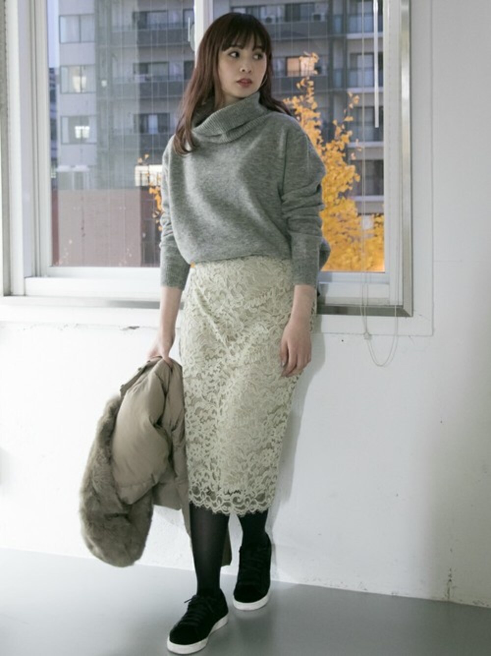 首元が詰まり過ぎないオフタートルでゆとりをもたせフェミニンな印象をプラス✨