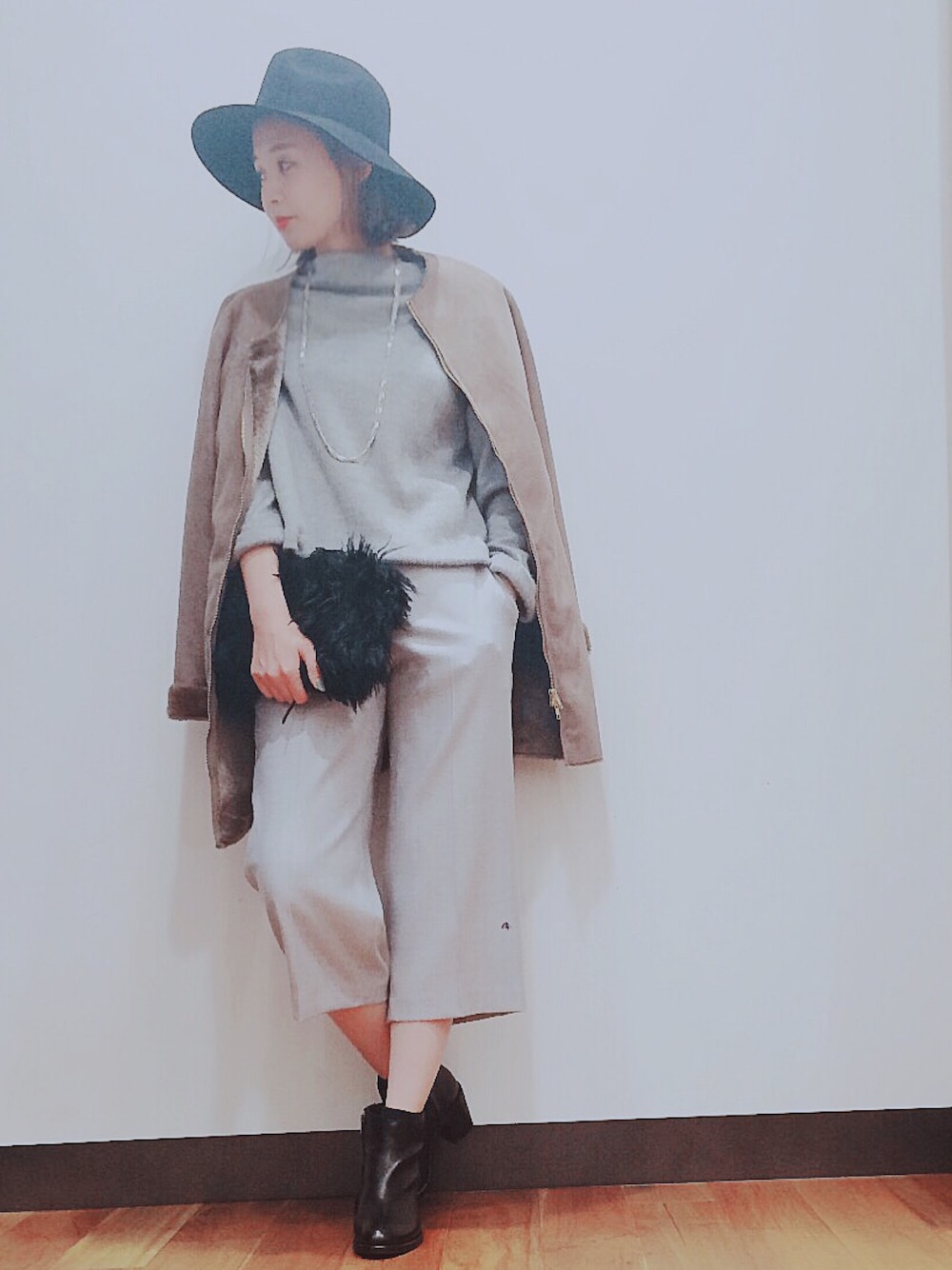 今年よく見るグレーのワントーンコーディネート。 ノーカラームートンコートをサラッと羽織り、小物は黒で合わせました🎩 フェイクムートンなので軽く、サラッと羽織れるのでとっても便利な人気アウターです♡