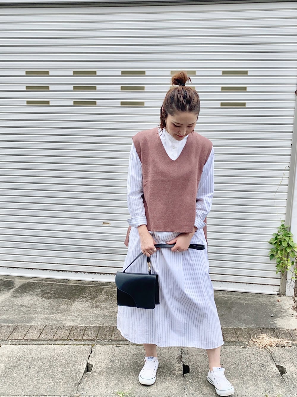 ブザムシャツワンピにニットベスト合わせて秋♡