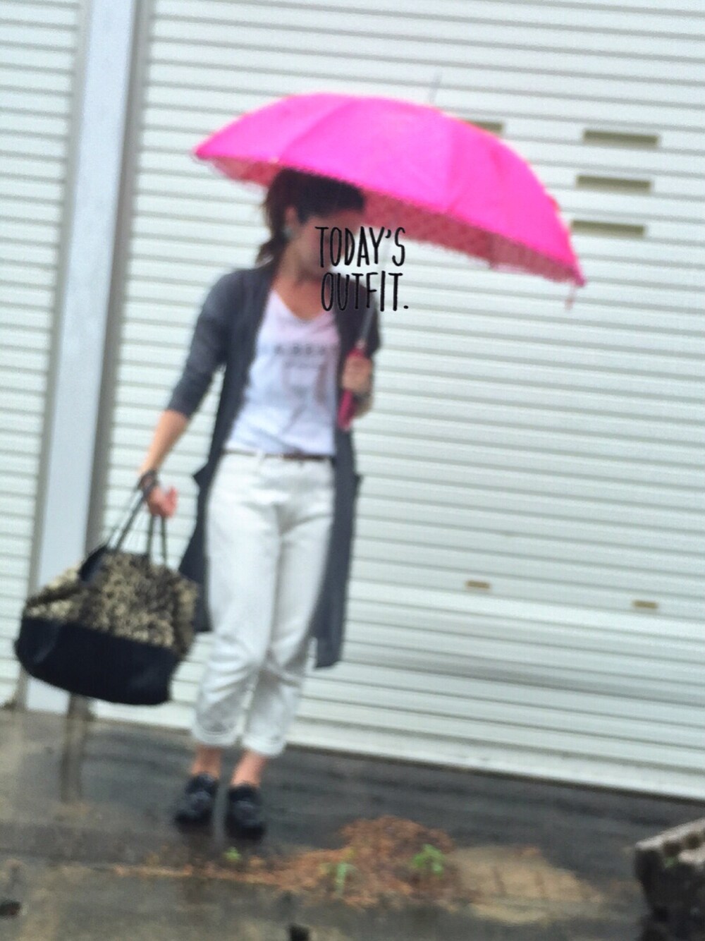 今日は雨ー 雨の中でも、チビに写メを撮らす鬼親です(^_^;) 案の定、ピントあってない残念な仕上がり 傘さしたまま撮るのは、まだ難しかったみたいです(笑) 雨の日コーデの鉄板は、濡れてもいい靴! 髪の毛はひっつめる! これを守れば快適に1日過ごせます☺︎