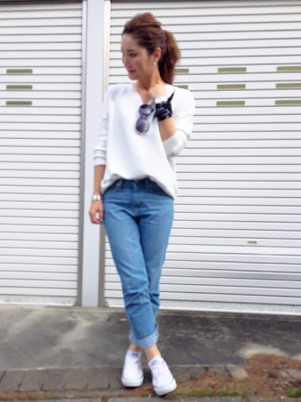 ほしららのニット/セーター「編み地切り替えVネックニットプルオーバー」を使ったコーディネート