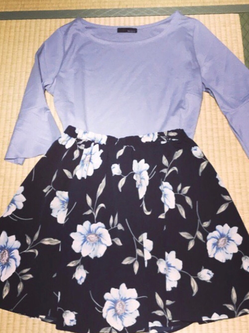 フレアトップス×花柄フレアスカート 寒色系の服が好きです