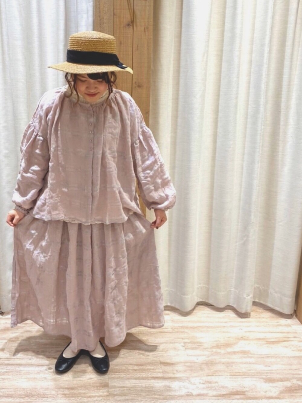 お久しぶりの投稿です♪ 今回は春の新作を着てみました🌸 ブラウスとスカートはセットアップです。 ラメが入ってて春のお日様に当たると、キラキラして可愛らしいデザインになってます♪ スカートのギャザーとブラウスのふんわり感が SamasaMos2らしさが出ます♡ インナーのバテンレースカットソーもスタンド襟で着回しにも使えます!! だんだん気温も上がってきて春らしくなってきました🌸🌸 是非お店にも見に来てください♪