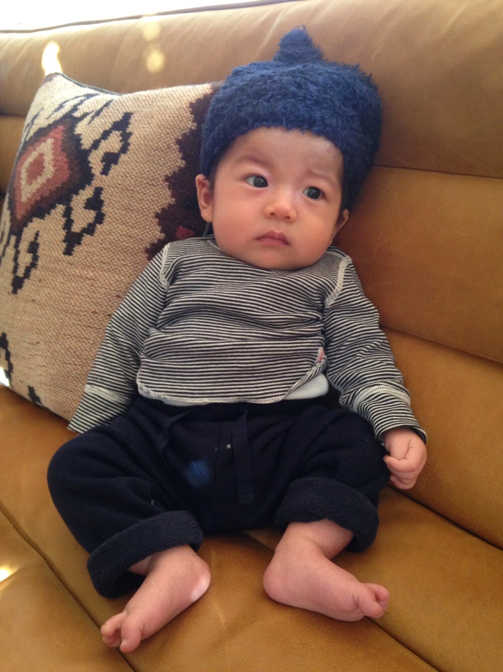 出産お祝いのモケモケ帽を試着 無表情だす