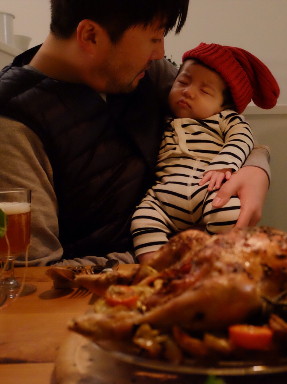 クリスマスイブ、とーちゃんがジェイミーオリバーのレシピでチキンを焼いてくれました ちびっこサンタは寝ています