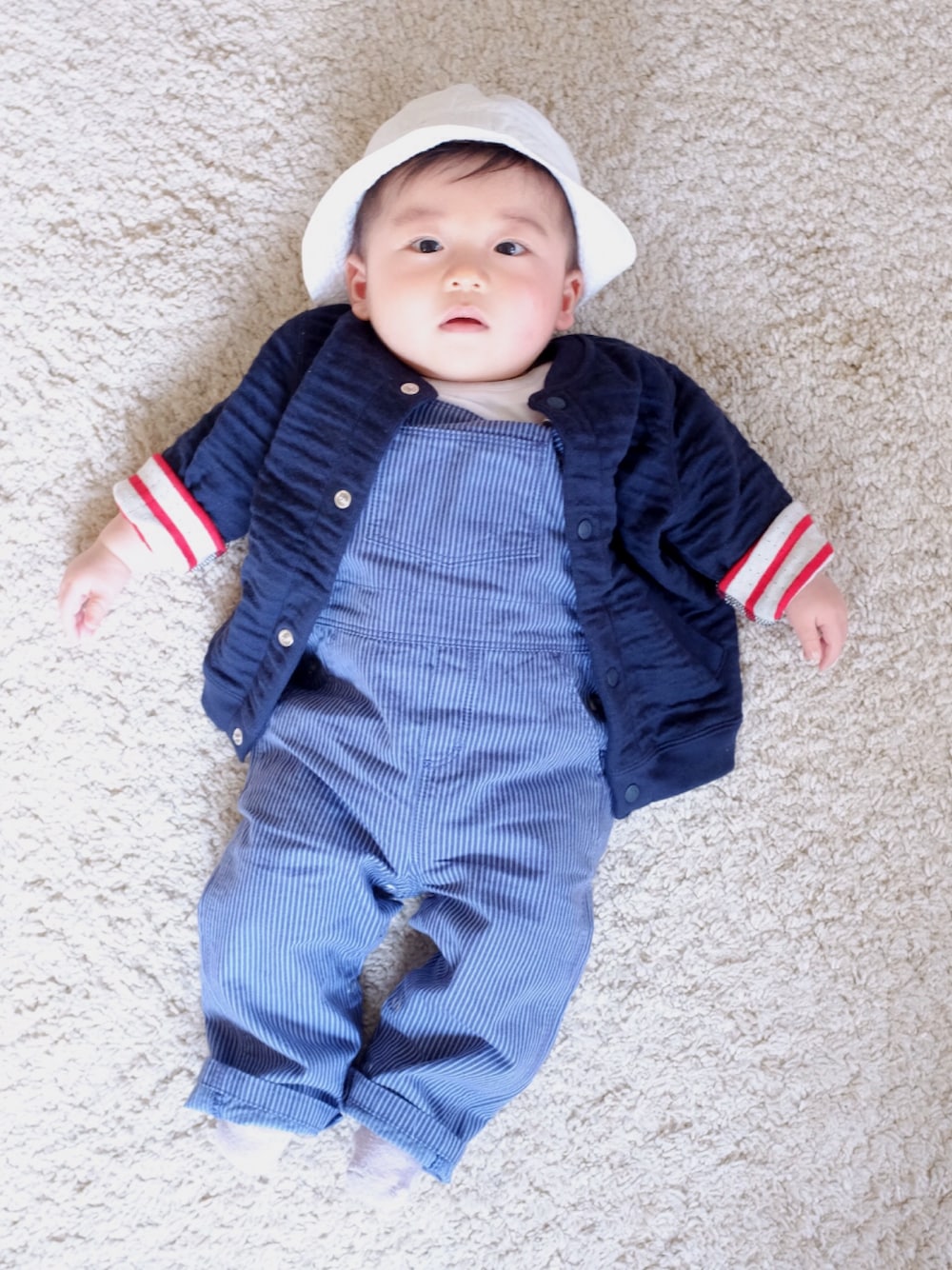 冬のセールで買っていた物を着てみました。まだまだ着れないなぁーなんて思っていた12m。ゆったりはしているけれど普通に着れてしまうくらいに。成長早いなぁー!帽子だけは6m。春夏に向けなのにサイズアウトぎみ。小顔の夢は破れた(笑)