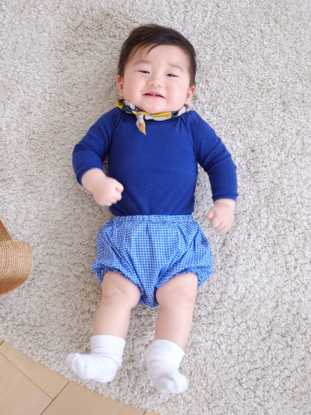 暑いので私も帽子が必要!ということで麦わら帽子出しました。 息子、どうもその帽子が気になる様で(ぴよーんって出てるヒモとか大好物)抱っこすると触りまくってきます。 寝転がってる息子に与えてみると案の定大喜び! 可愛くて沢山写真撮りました〜。 ブルマは何年か前のだったみたいで安く買えた♪ が…ムチムチの息子の太ももにゴムが食い込みぎみです。 18monくらいの今度は買おう…