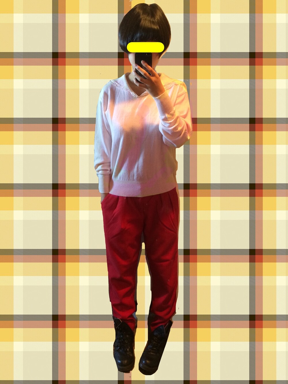 適当なコーデ。 ゆるーく。 戦時中の子供みたいだと言われました。笑 赤いズボン、シルエットが本当はもうちょっと可愛いんです!よ!
