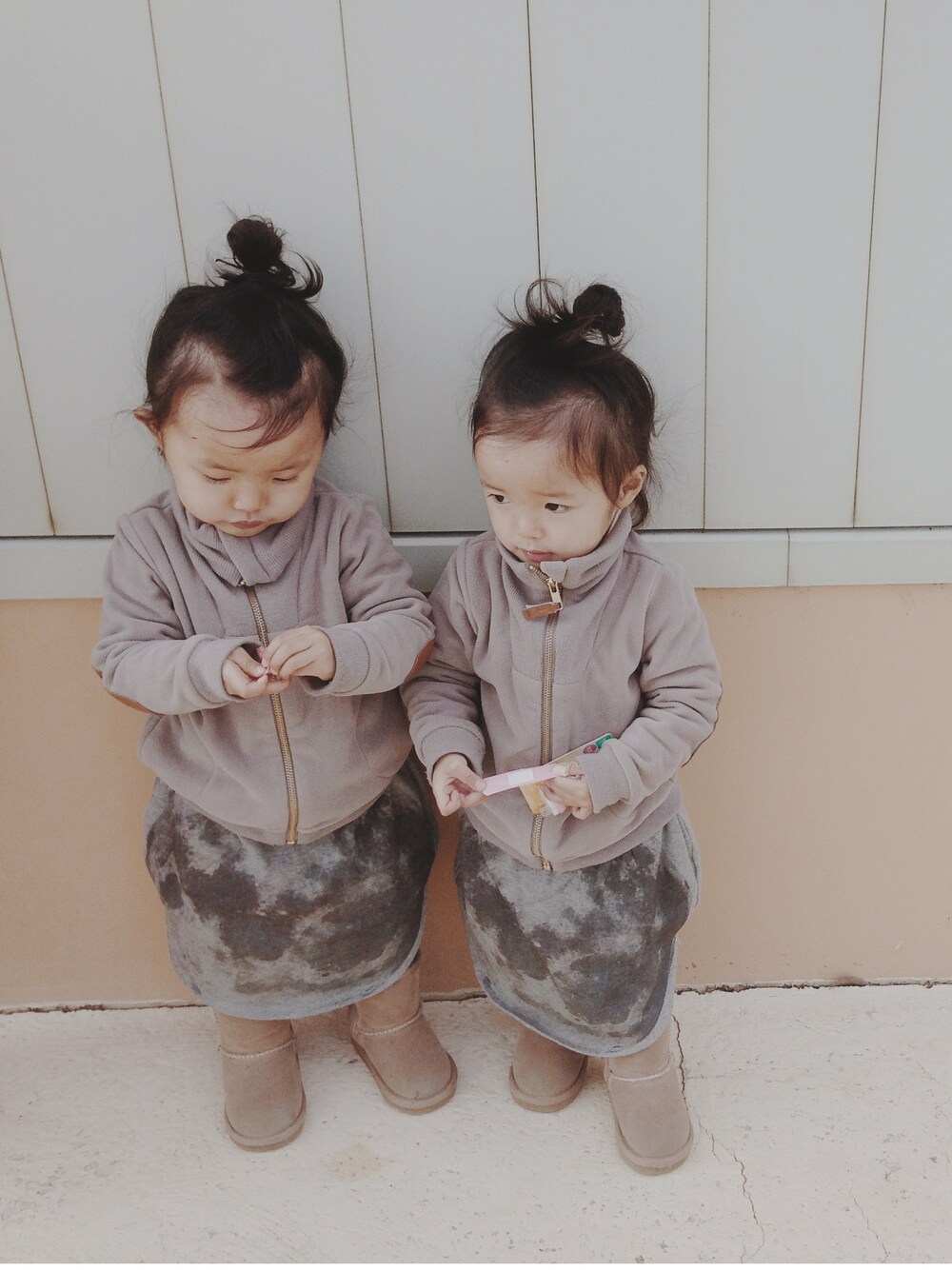 グレー系のスカートを着用したキッズの冬コーディネートの1枚目の写真