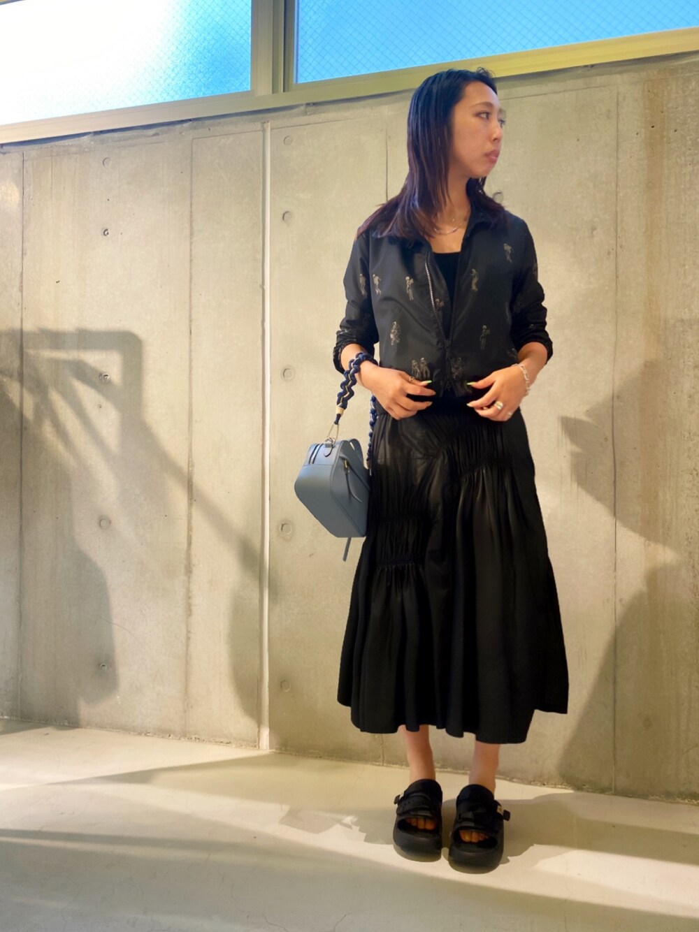 ナイロン風な素材感の トップスとフレアスカートを合わせて スポーティーな雰囲気に