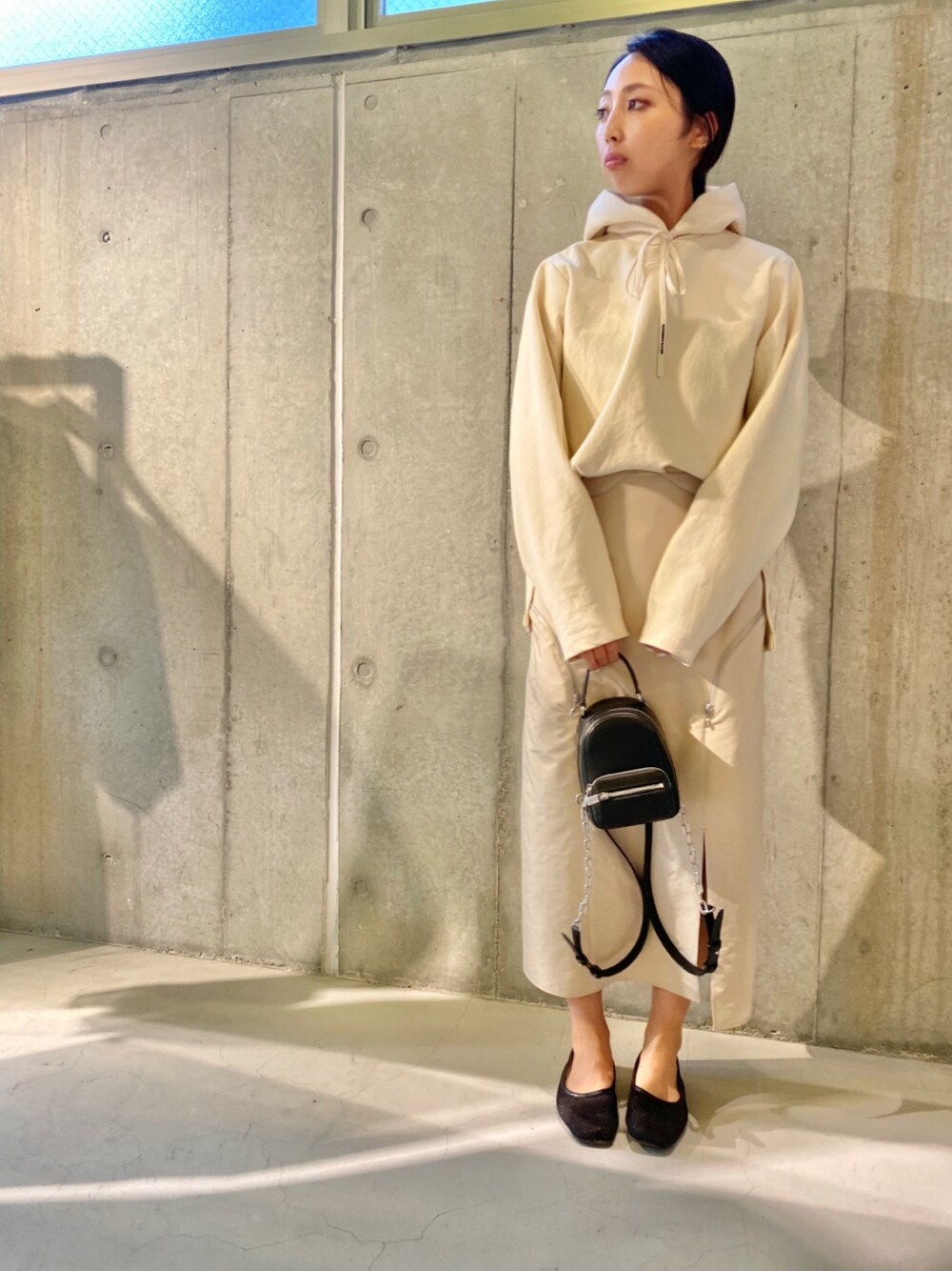 クリームで合わせたワントーン どちらもフォルムで遊んだ、 シンプルかつ都会的なカジュアルスタイル