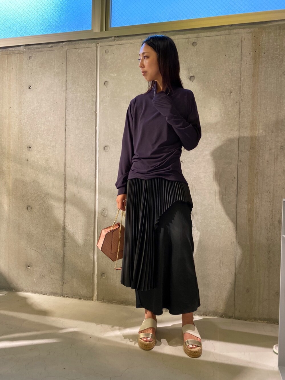 サリバンのアシメプリーツスカートに ブラックのサテンのレイヤードでモードに。