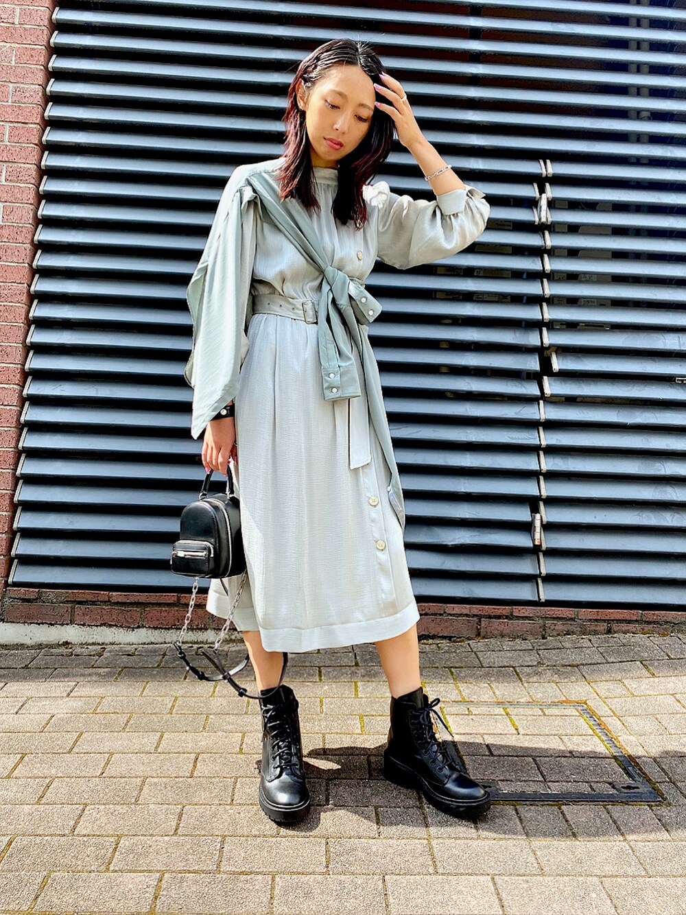 小物にハードめなテイストのものをあわせて可愛すぎなく。 薄手のワンピースは丈が長めなので 合わせるアイテムで 可愛らしくも大人っぽくも着られます!
