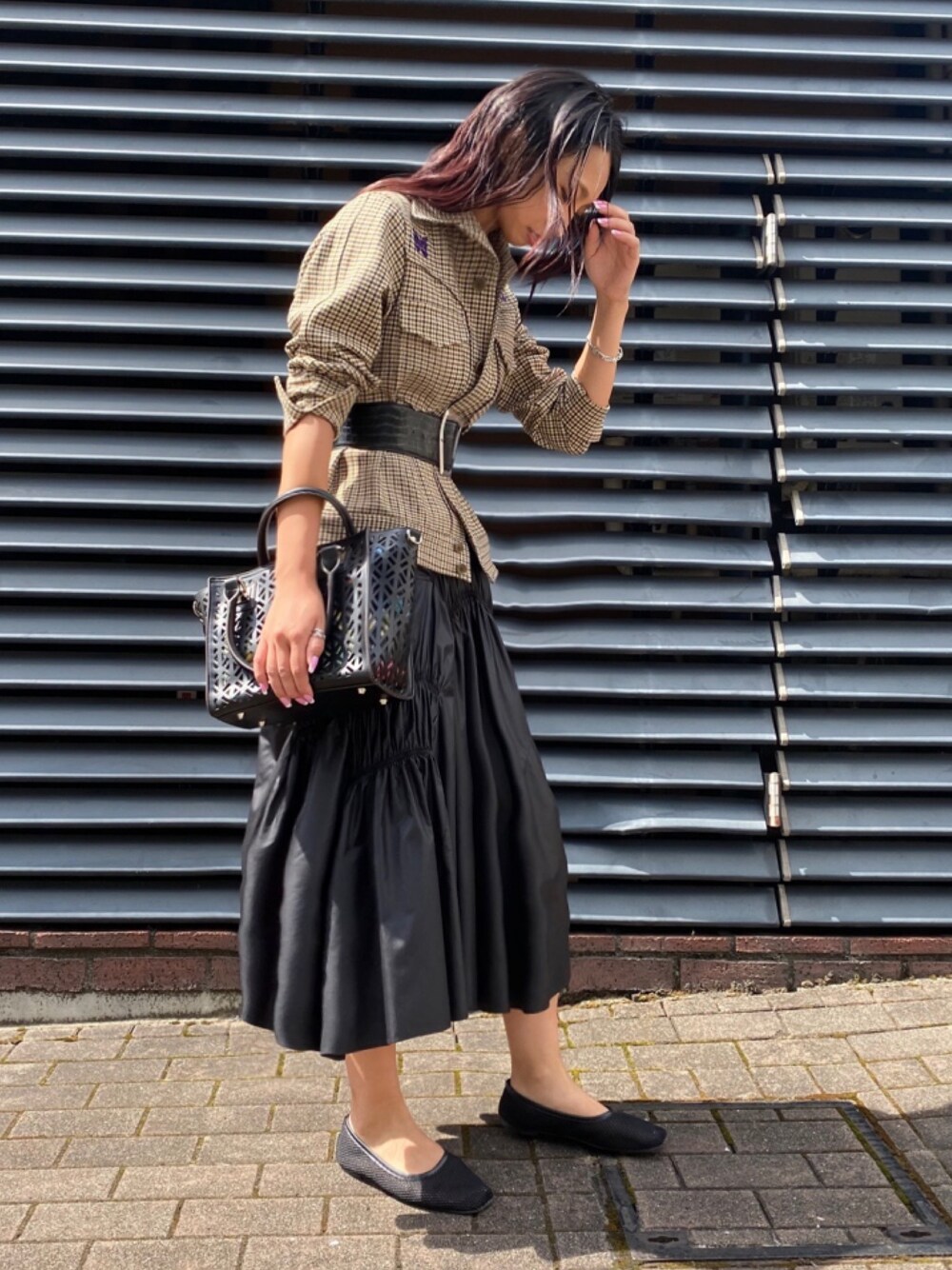 チェック柄のジャケットに 太ベルトでレトロな着こなしに。
