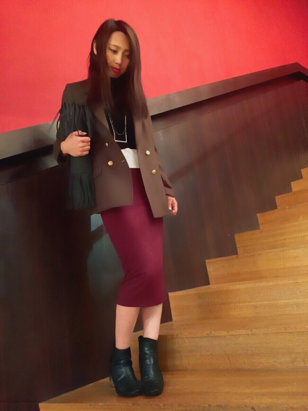 ジャケットスタイルもタイトスカートでマニッシュすぎない女性らしいコーデ♪