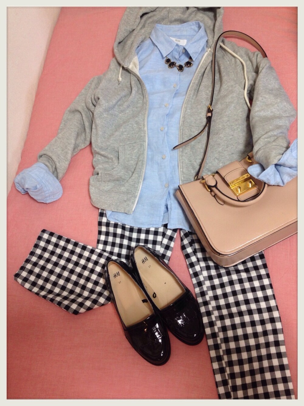 ユニクロコーデ パーカー→ユニクロ シャツ→ユニクロ パンツ→ユニクロ 靴→H&M ネックレス→ナチュラルビューティベーシック バッグ→miumiu