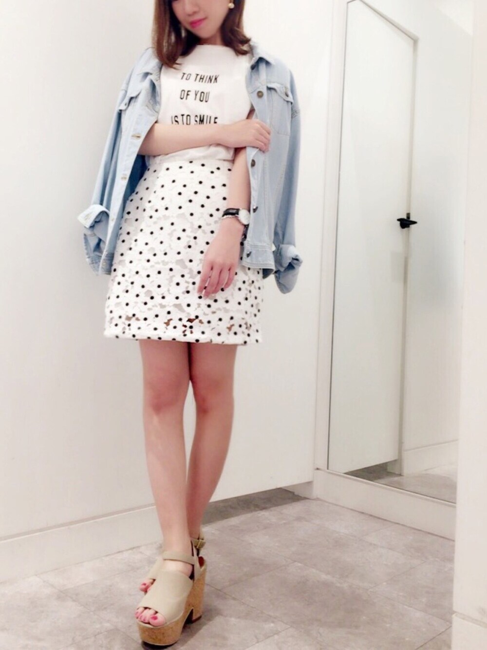 トレンドのドット柄🌻 デニムジャケットとロゴTでカジュアルダウンしてみました。