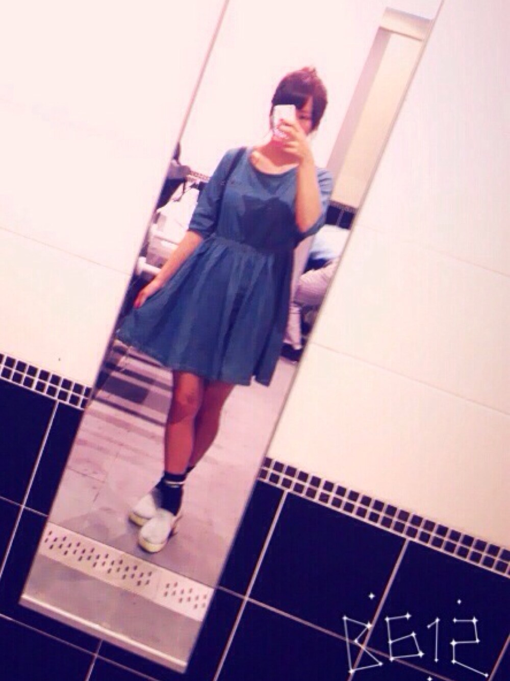 デニムのわんぴがゆるい感じ なので髪型はしっかりまとめ ました♡またラインソックスを 合わせることによって、 ガーリーさもでます😇♡