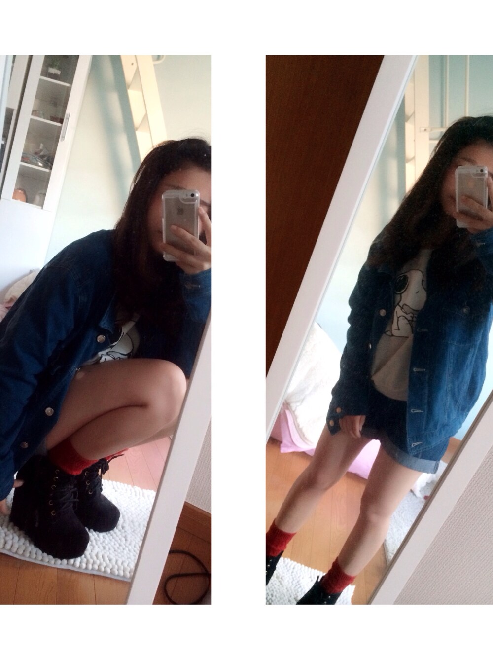 ブルー系のデニムジャケットを着用したレディースの秋コーディネートの1枚目の写真