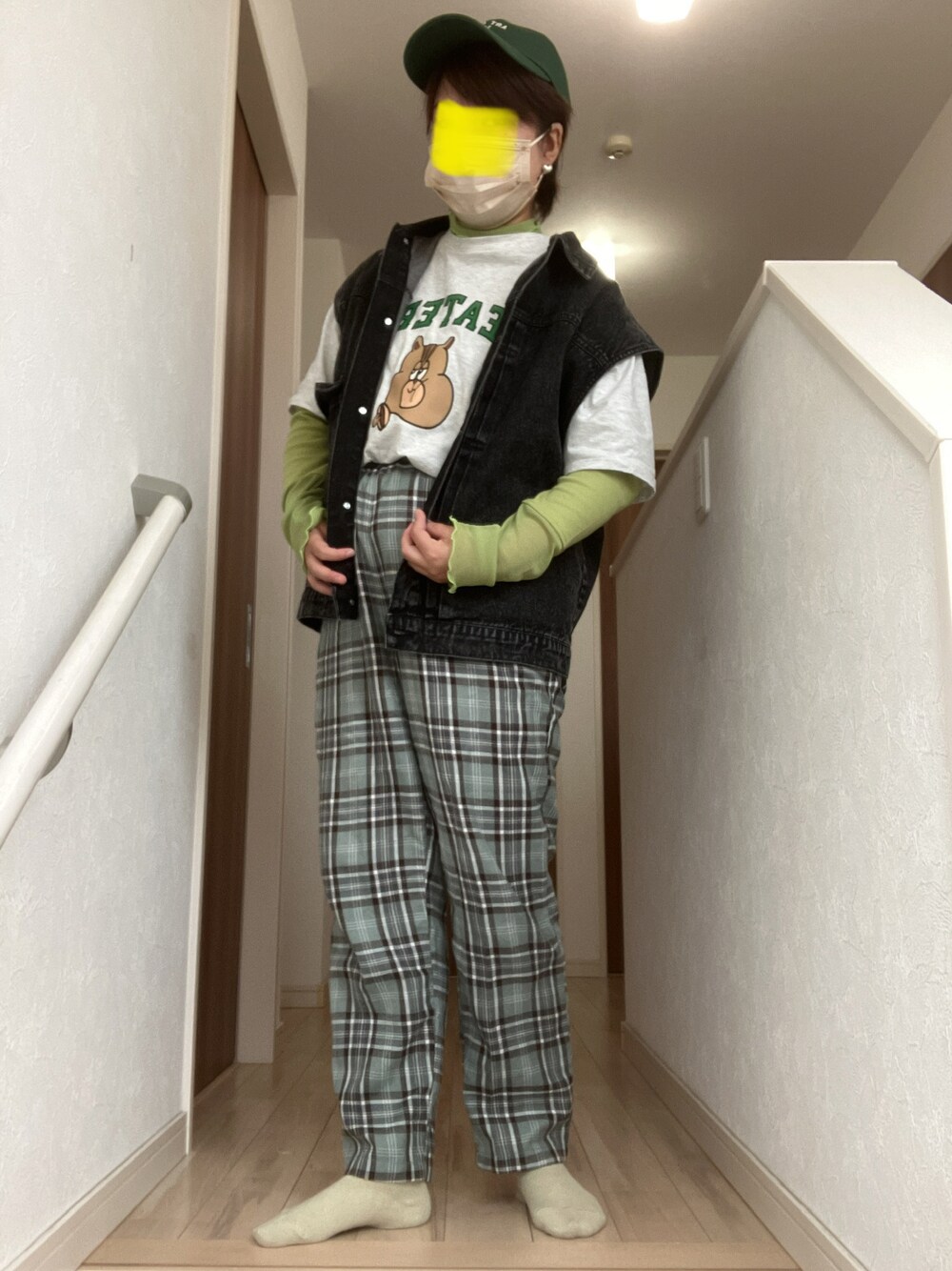 今日は、このTシャツを着たいのとシアートップスがどうしても 着たくて初めてレイヤードコーデしてみました✨✨ グリーンカラーメインで、 ブラックデニムベストを 合わせてパキッとカジュアルコーデにしました♪