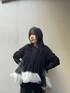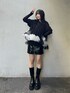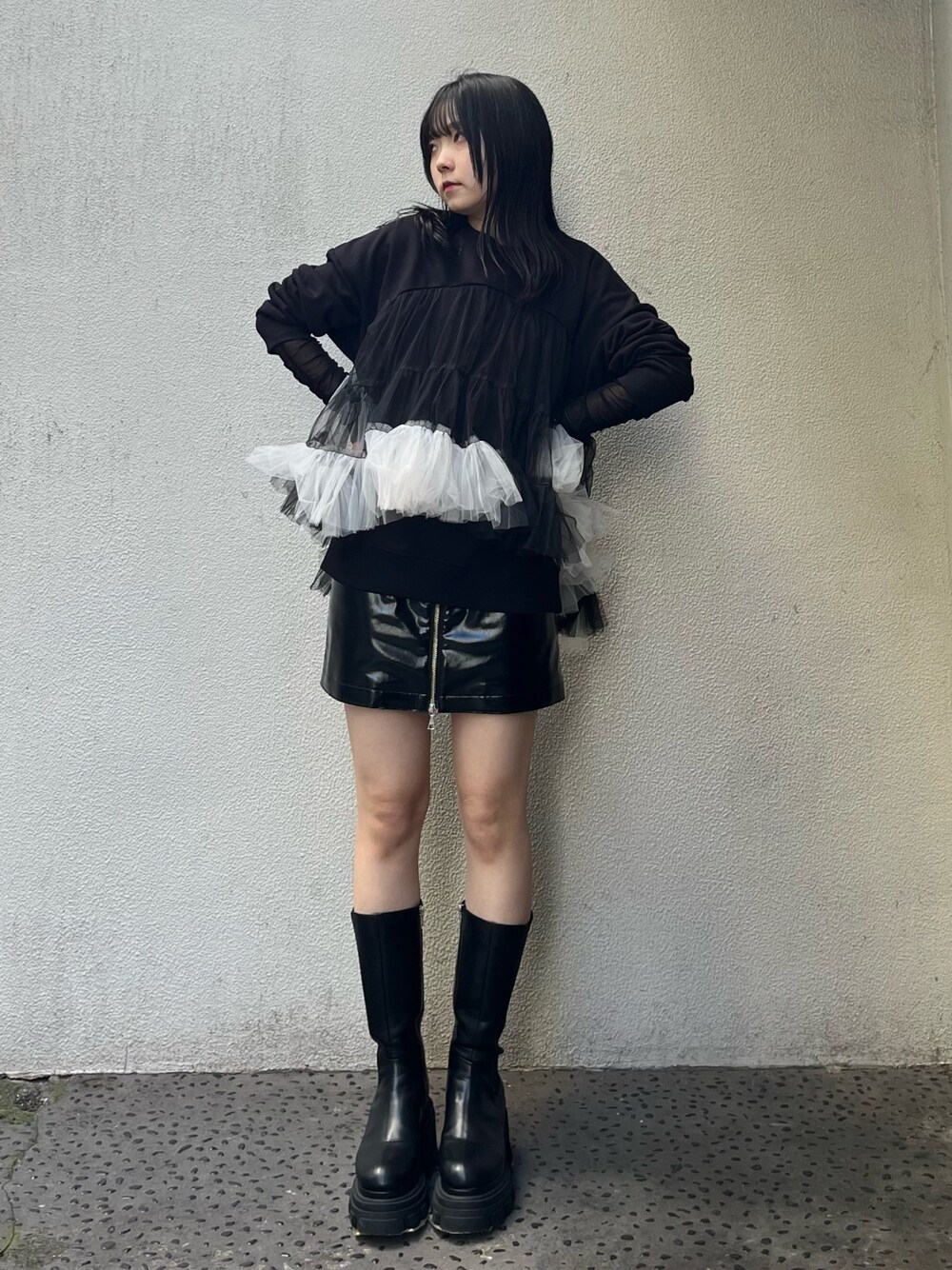 155cm骨格ウェーブです。 スウェット×チュールデザインが目を引くトップスコーデ。 ミニスカで合わせてコンパクトなシルエットに。