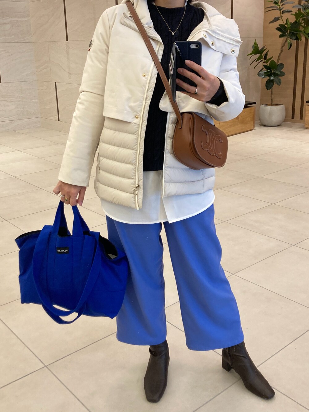 今日は冬の寒さです。コットンニット、ウールの薄手パンツ、ホワイトダウンでお出かけします。