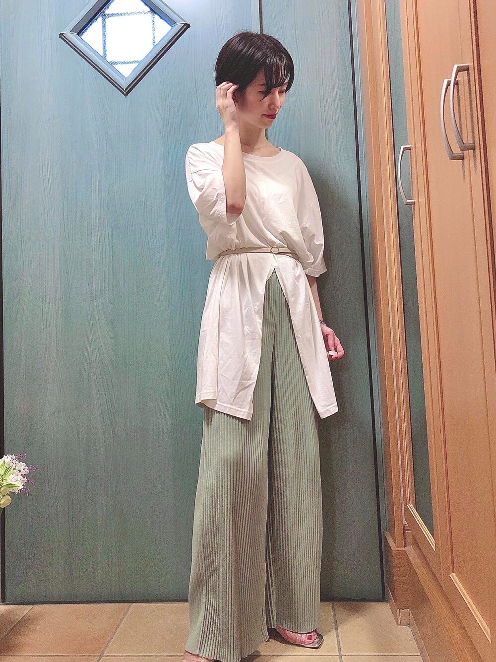スリットT×プリーツパンツ で脚長効果バツグンコーデ✨ まだまだ残暑残る日に涼しげなコーデ🧼🌿