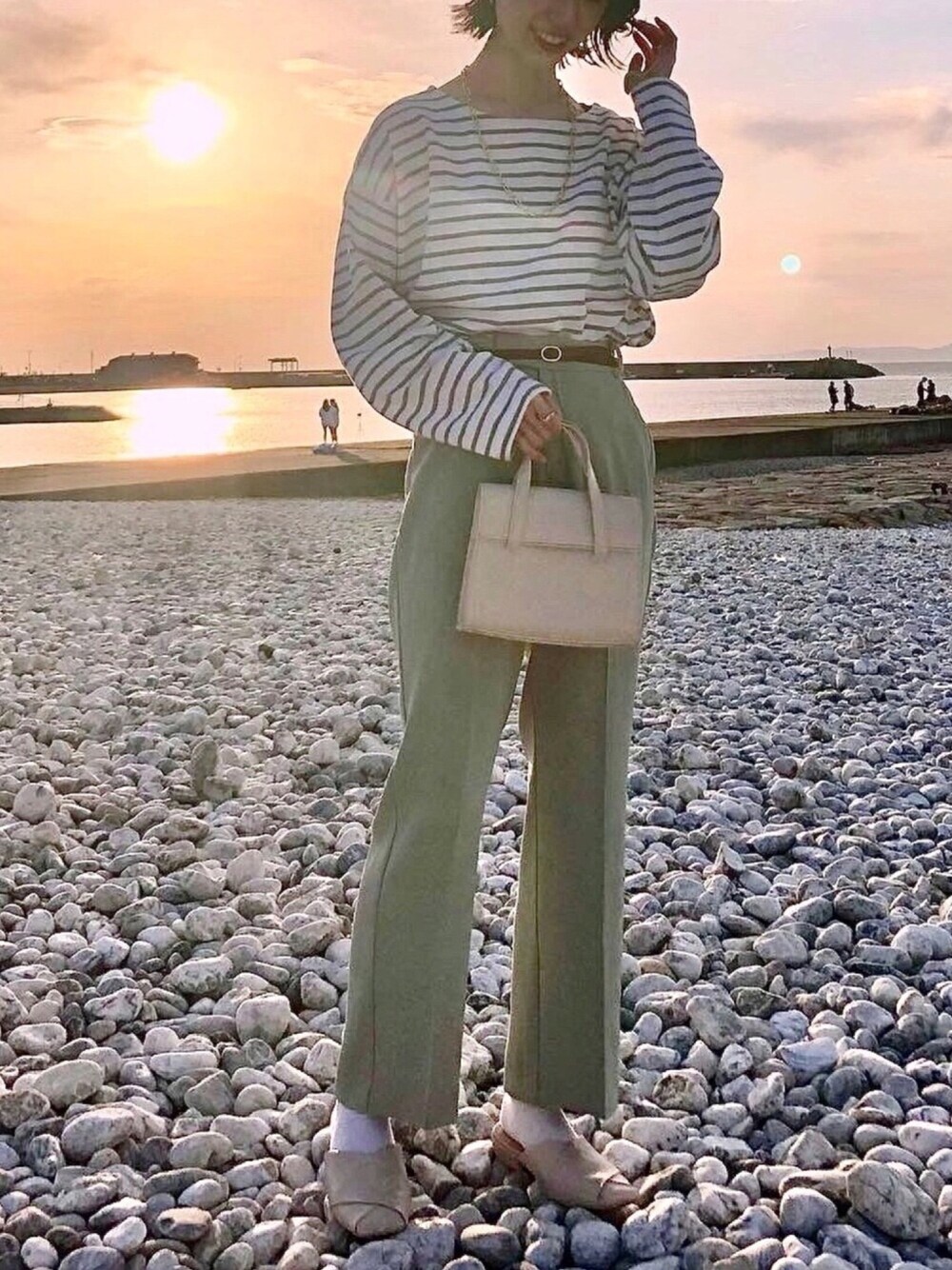 いつもご覧いただきありがとうございます🌅🏖 ひさしぶりの海辺で、絶景の夕焼けを収めることができて大興奮な1日♡笑 だったときの写真です🤭 ローリーのパンツといえばこれ🌿 というくらい本当に一番形が美しくて the きれいめ大人女子❕なこのフレアパンツ😭 何よりもこのシルエットがほんとうにだいすきで😭😭 きれかわいい、、 新作はどれも選べないくらいカラー展開も形も素敵なのですが、 やはりこのセンタープレスシリーズ、、屈強、、無敵感、、、 毎日一目惚れしてます(?)🤍