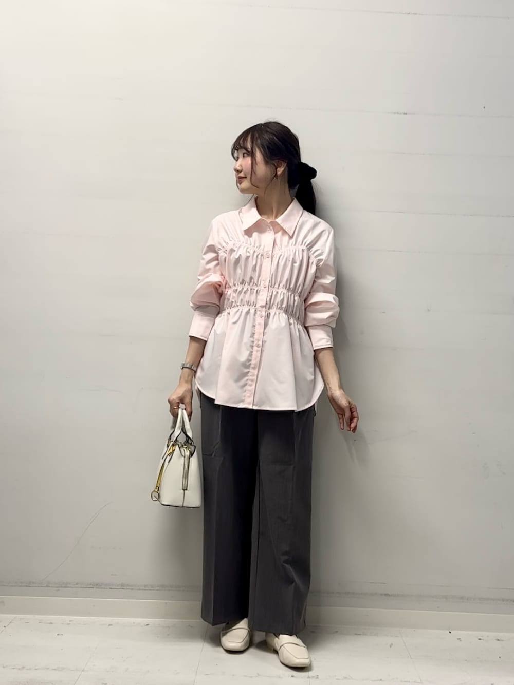 ご覧いただきありがとうございます! 春らしい色味のシャツ🌸 シャーリングデザインが可愛いです! スラックスと合わせて甘すぎないコーデにしてみました◎