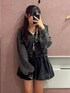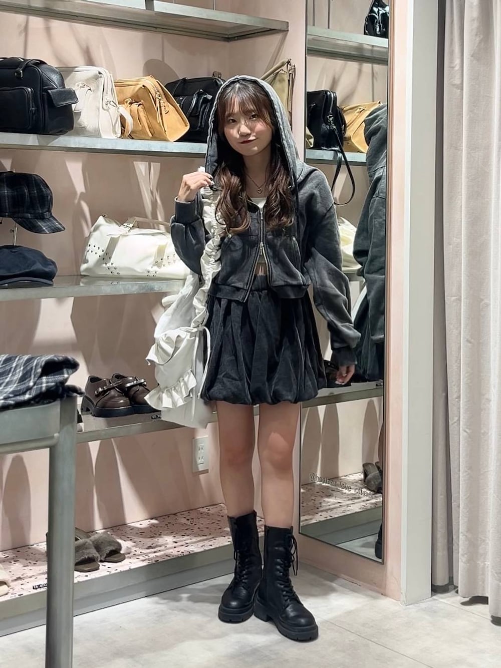通学コーデにもおすすめなセットアップ♡ スカートはウエストが紐で調節出来るので体型問わず着ていただきやすいです! フーディもWジップなのでオシャレ見えしてくれます♡
