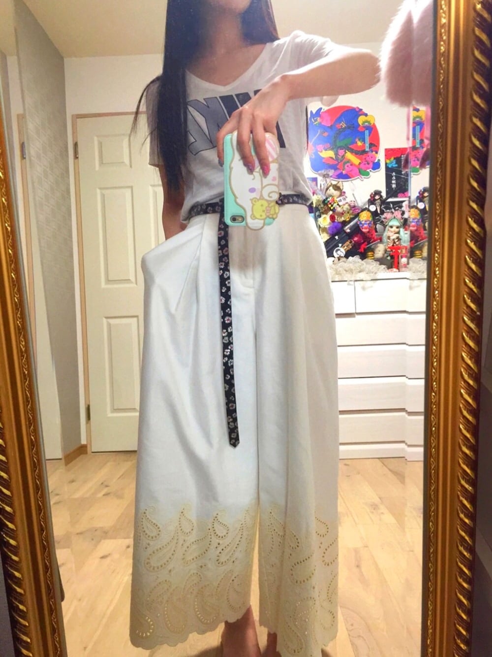 NIKEのTシャツとデニムスカンツの白コーデ。