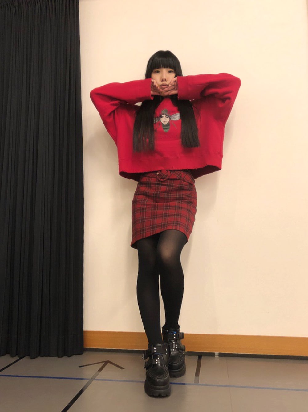 今日は朝からリハーサルでした! クリスマスだし赤コーデ🎅💕 このハチ?あんまり見つめちゃいけない感じするよね👀