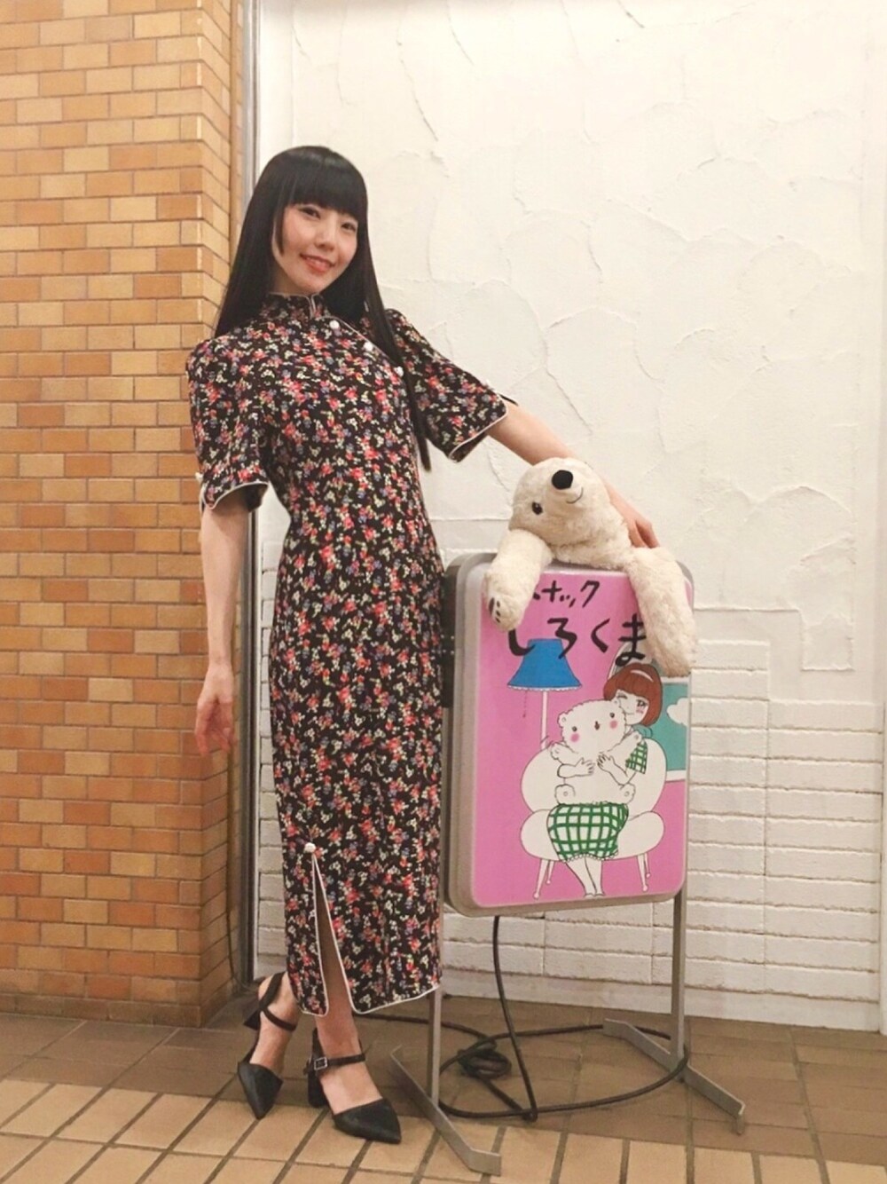 相沢梨紗のワンピース「PRINTED RAYON CREPE HIGH NECK DRESS」を使ったコーディネート