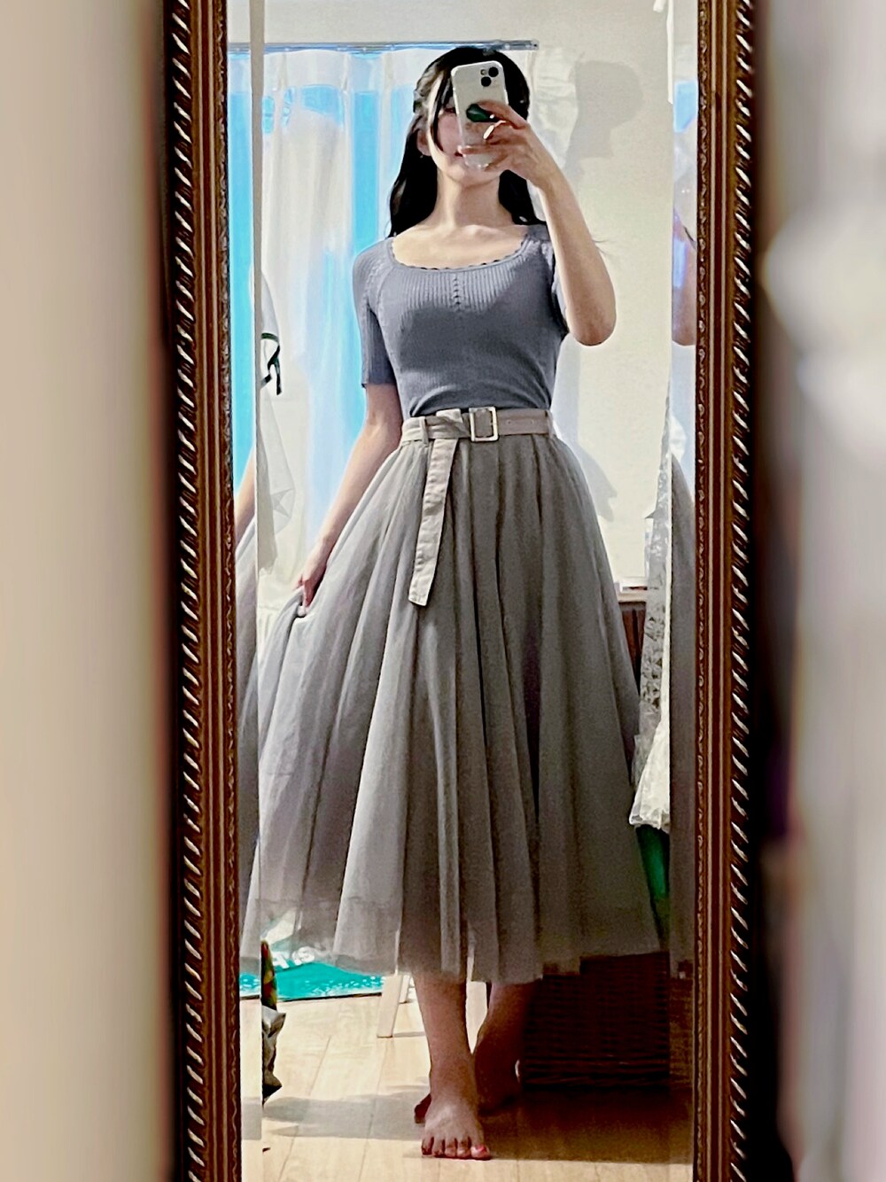 サマーニットにチュールスカート🤍 曇り空に擬態したみたいなカラー💙