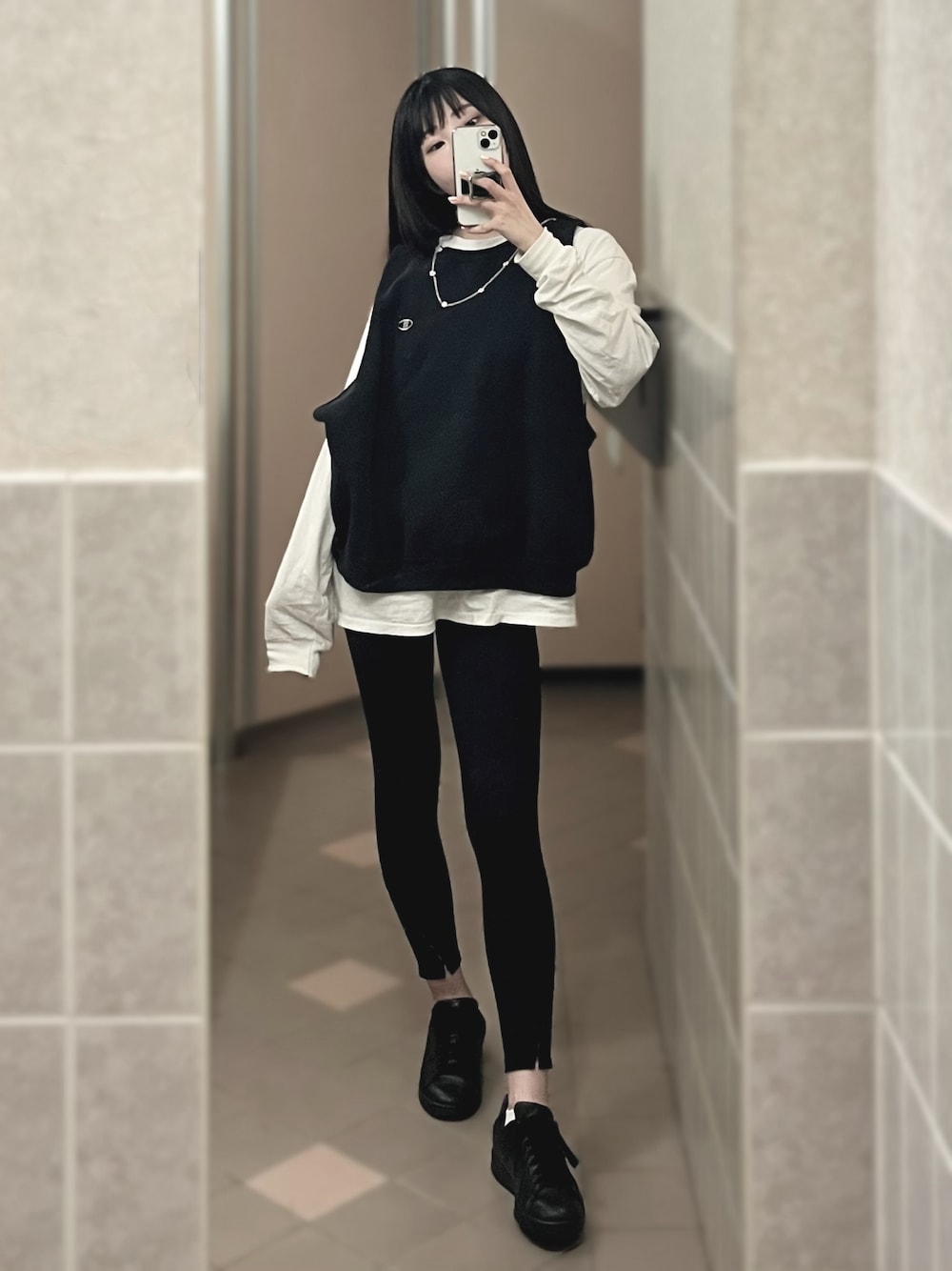 ロンTと古着のフリースをカットしてベストに💖スポーティな秋スタイル🍎